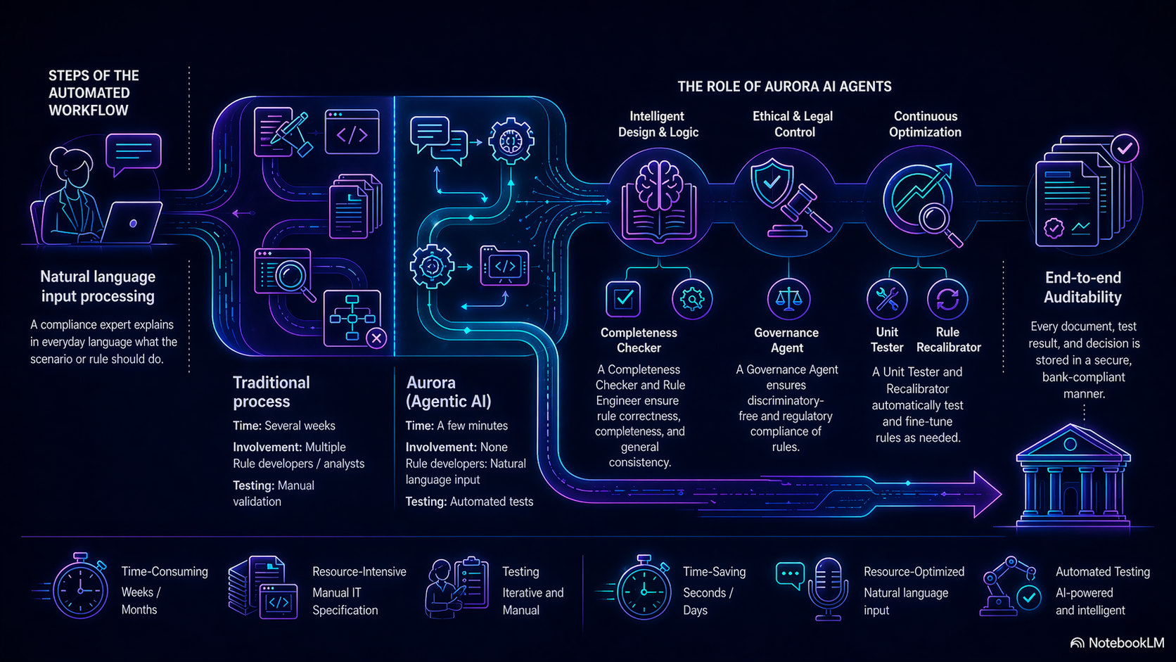 With Aurora, those same steps collapse into one directed workflow. The expert writes the requirement in natural language. The agents take over from there, turning it into a formal rule, testing it, validating compliance, and loading the result into production. What used to take weeks now takes days, and the scenario that comes out is documented, traceable, and always editable by the team responsible for it, so final control stays with the people who own the risk.